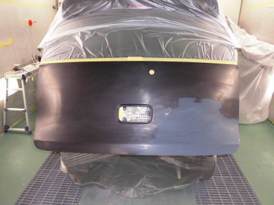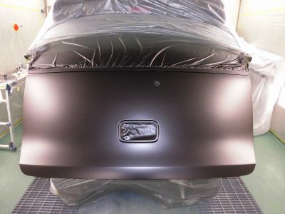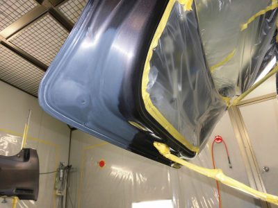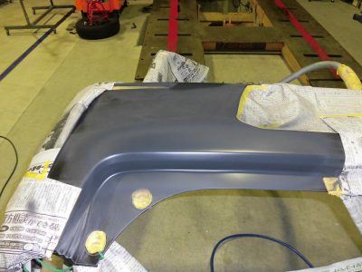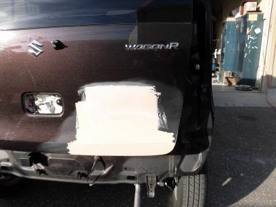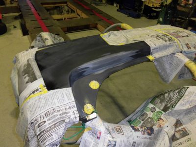 また、サフェーサー塗布前には、鈑金した周辺部を細かいサンドペーパーで研磨する「足付け」や余計なところまで塗装しないように、マスキングをします。