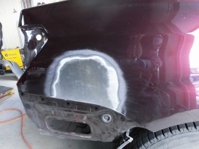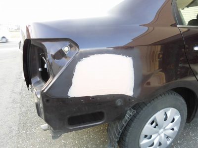 リアバンパーの凹みは熱を加えることで修正可能です。